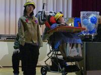 11月8日(土)に学習発表会が行われました。中学部は、学年ごとの発表でしたが保護者の皆様や地域の方々、放課後デイサービス等の多くの方に御参観いただき感謝申し上げます。中学部1年生は、ごみを減らすヒーローとして、ごみのリサイクルについての発表を行いました。燃えるごみや燃えないごみなどの分別をして、それがTシャツに生まれ変わる流れを教えてくれました。中学部2年生は、ペットボトルロケットを自分たちで製作し、様々な条件でロケットを飛ばす動画を基にクイズを行いました。シンキングタイムではヒゲダンスを披露し、発表会を盛り上げてくれました。中学部3年生は、見学旅行で行った青少年科学館のボディアドベンチャーエリアで体験した血液や骨についての学習を、医者や看護師、患者や体内で働く細胞に役割を分担し、分かりやすく発表してくれました。